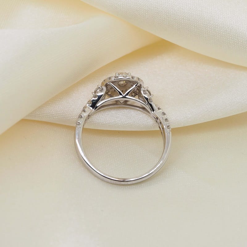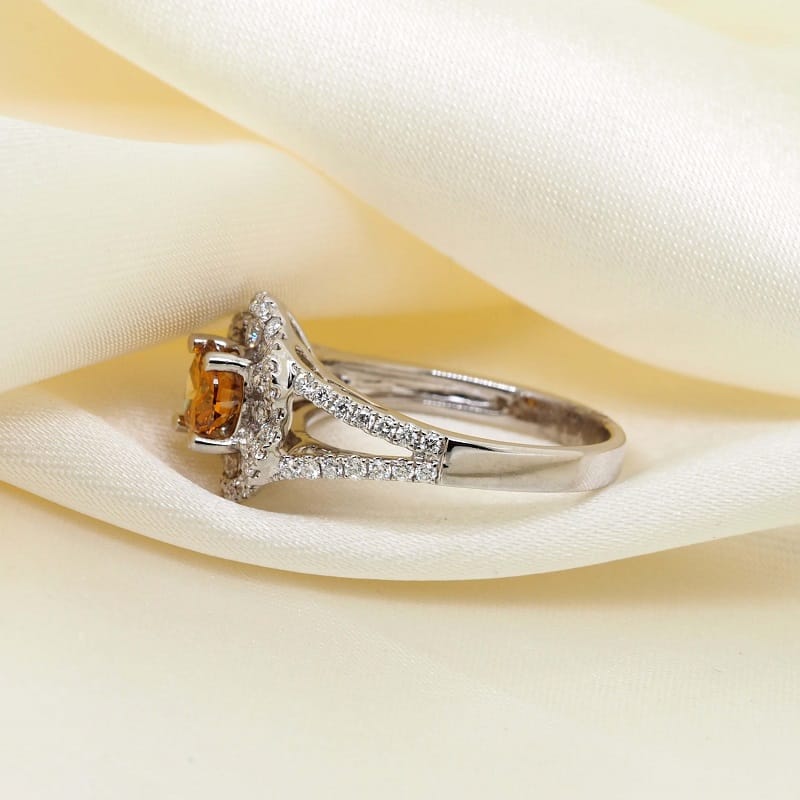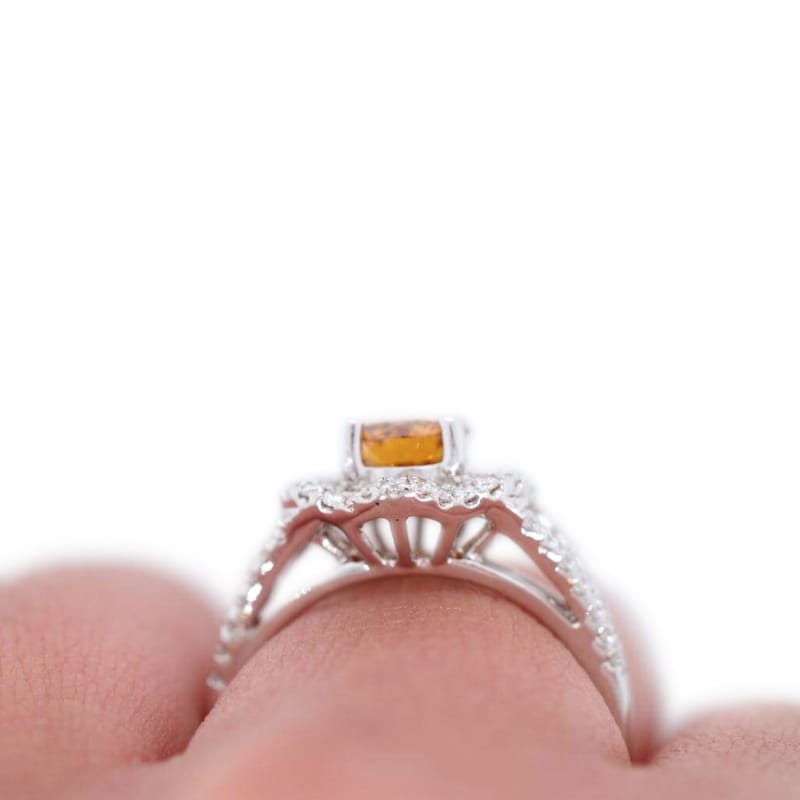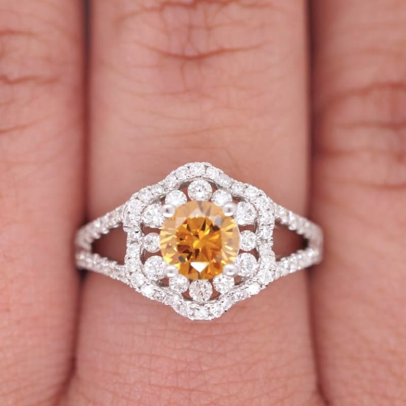 This ring features a 0.82 carat round fancy vivid yellow diamond center accented by a double halo of round brilliant diamonds outlined in a floer design. The sides feature a diamond embedded split shank setting forming an elegant design!