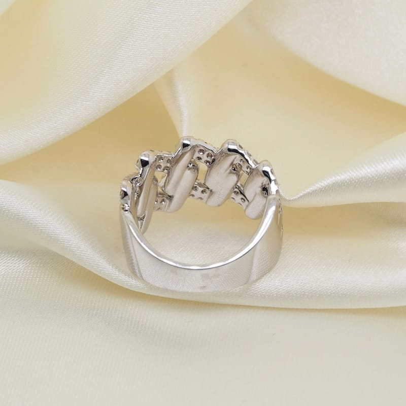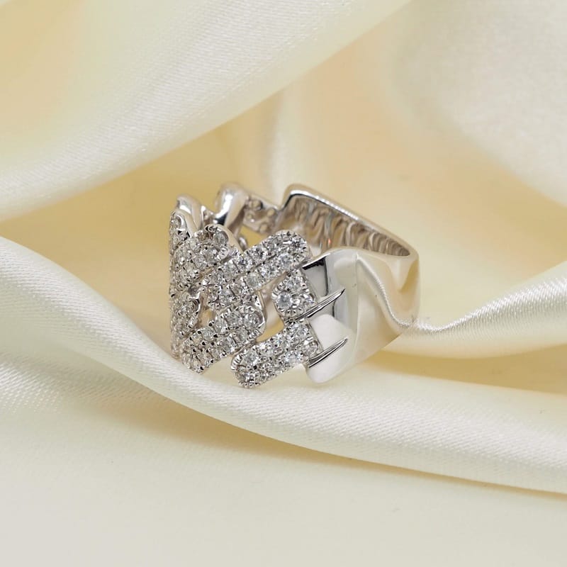 This 18K white gold ring has a pattern of interlocking links. These links have a pave of diamonds, creating an elegant pattern between the stones and the space between them.