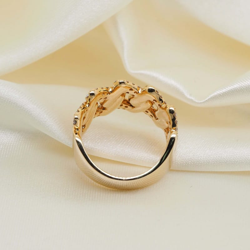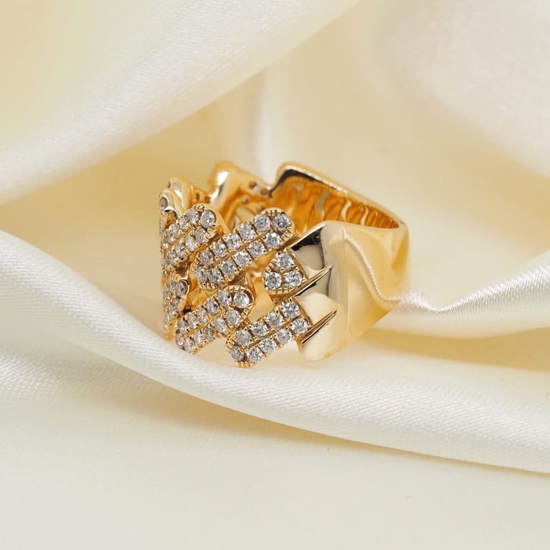 This 18K yellow gold ring has a pattern of interlocking links. These links have a pave of diamonds, creating an elegant pattern between the stones and the space between them.