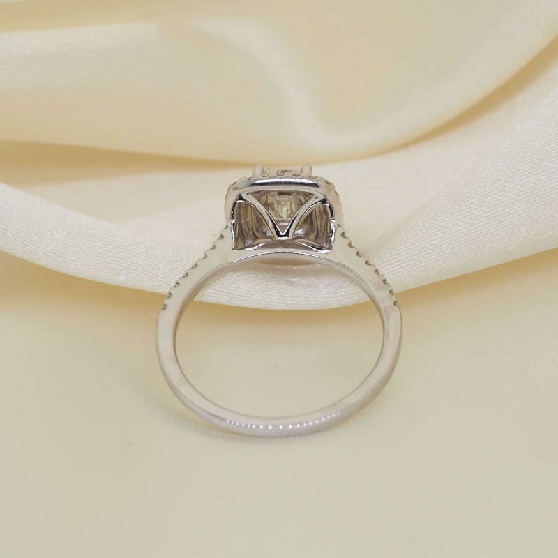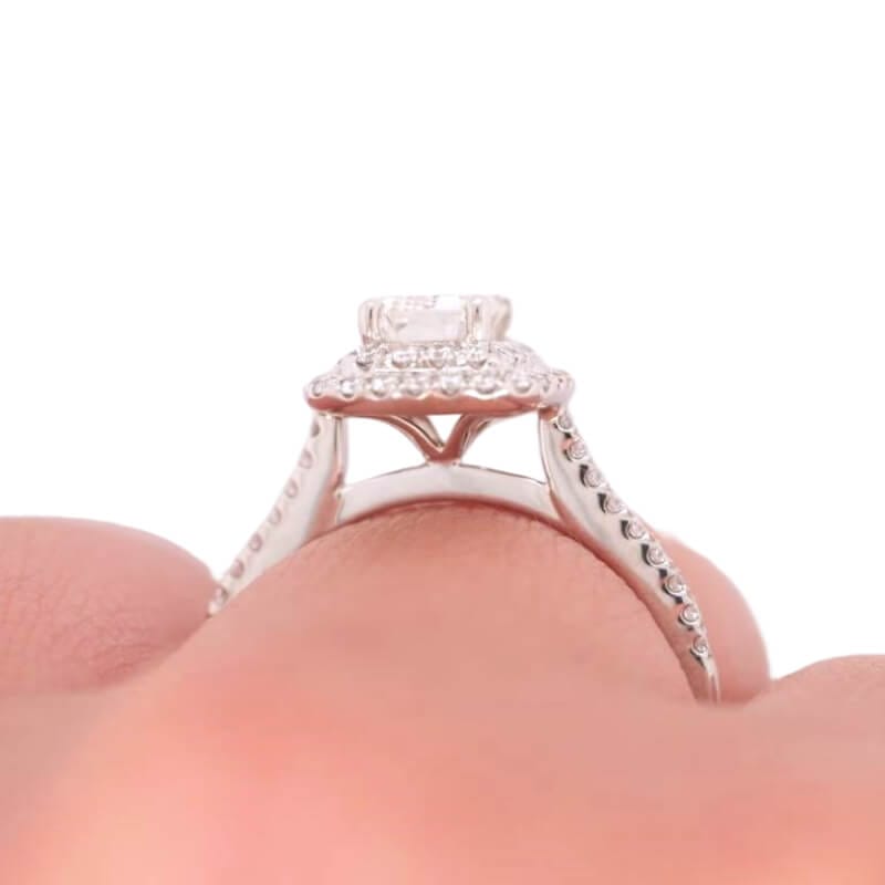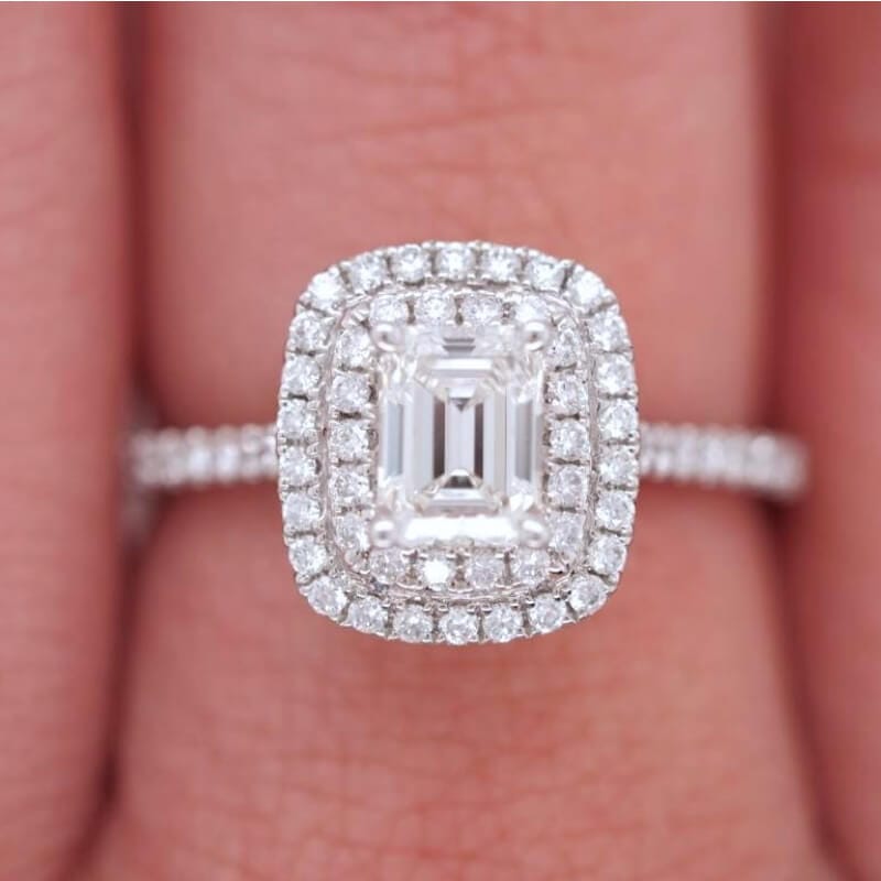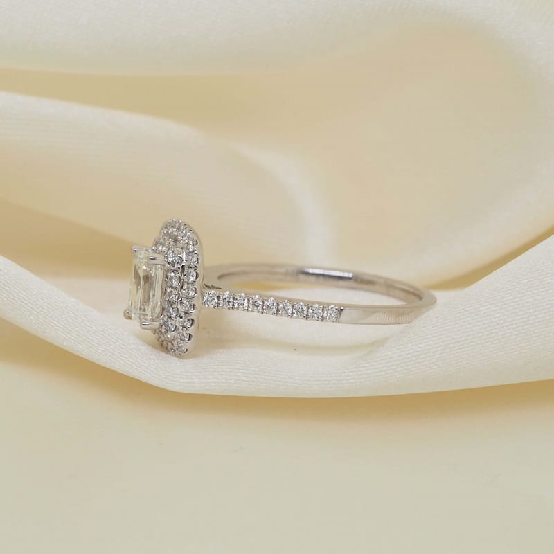 This ring features a 0.66 carat emerald cut diamond center adorned by a double halo sitting upon a cathedral setting complimented by smaller round diamonds down the sides all set in 18-karat white gold.