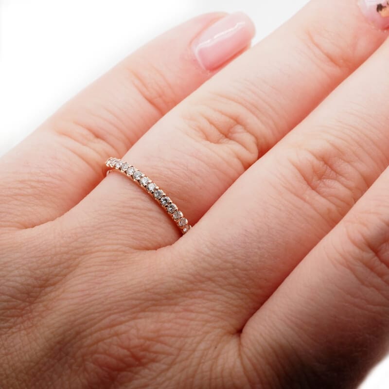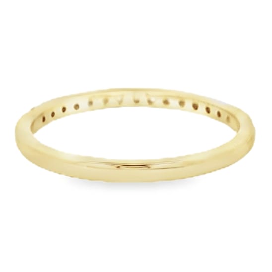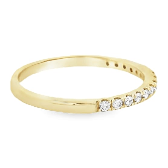 This 1.70 mm wide, light flat fit band features 16 round brilliant cut diamonds on the face of the ring in 14-karat rose gold.