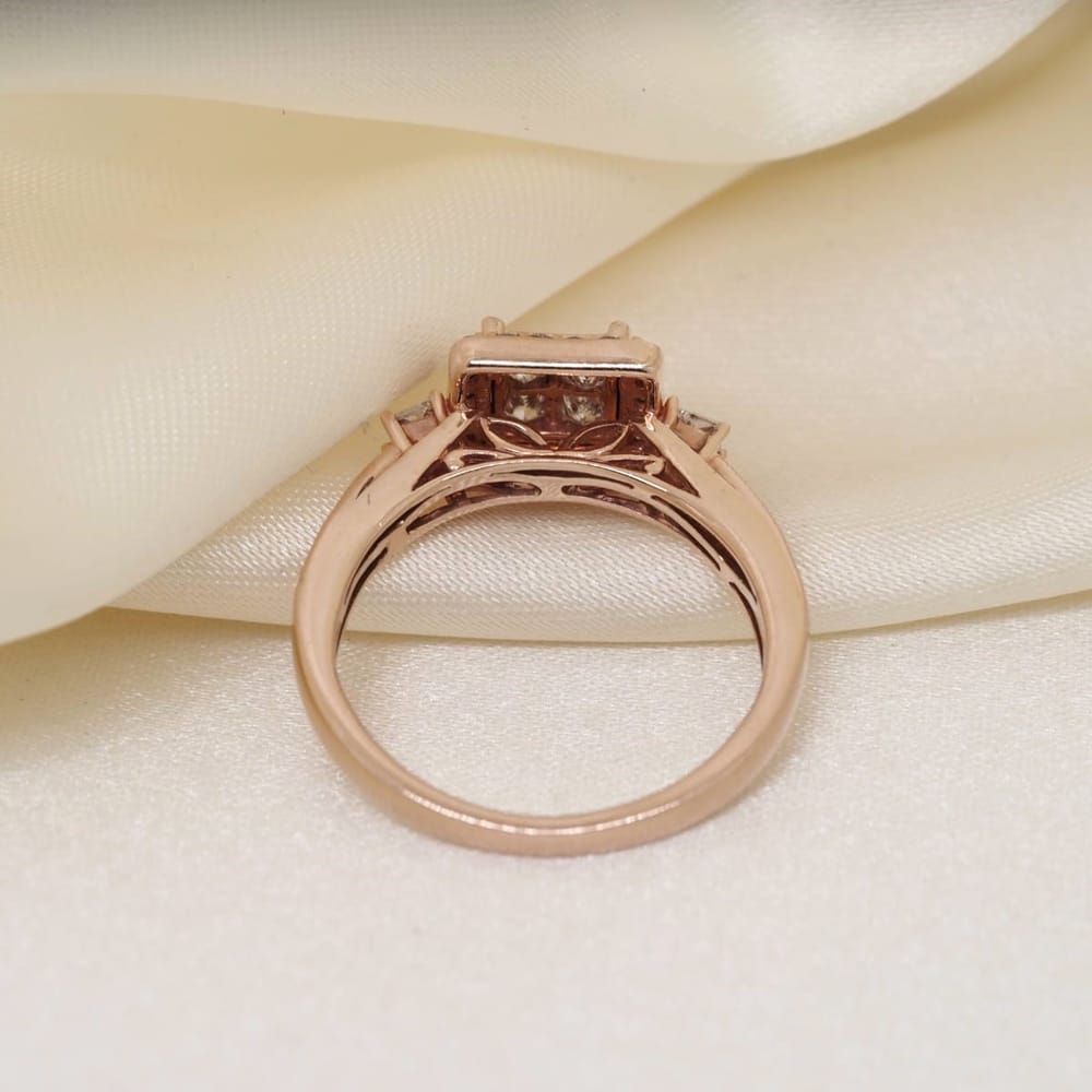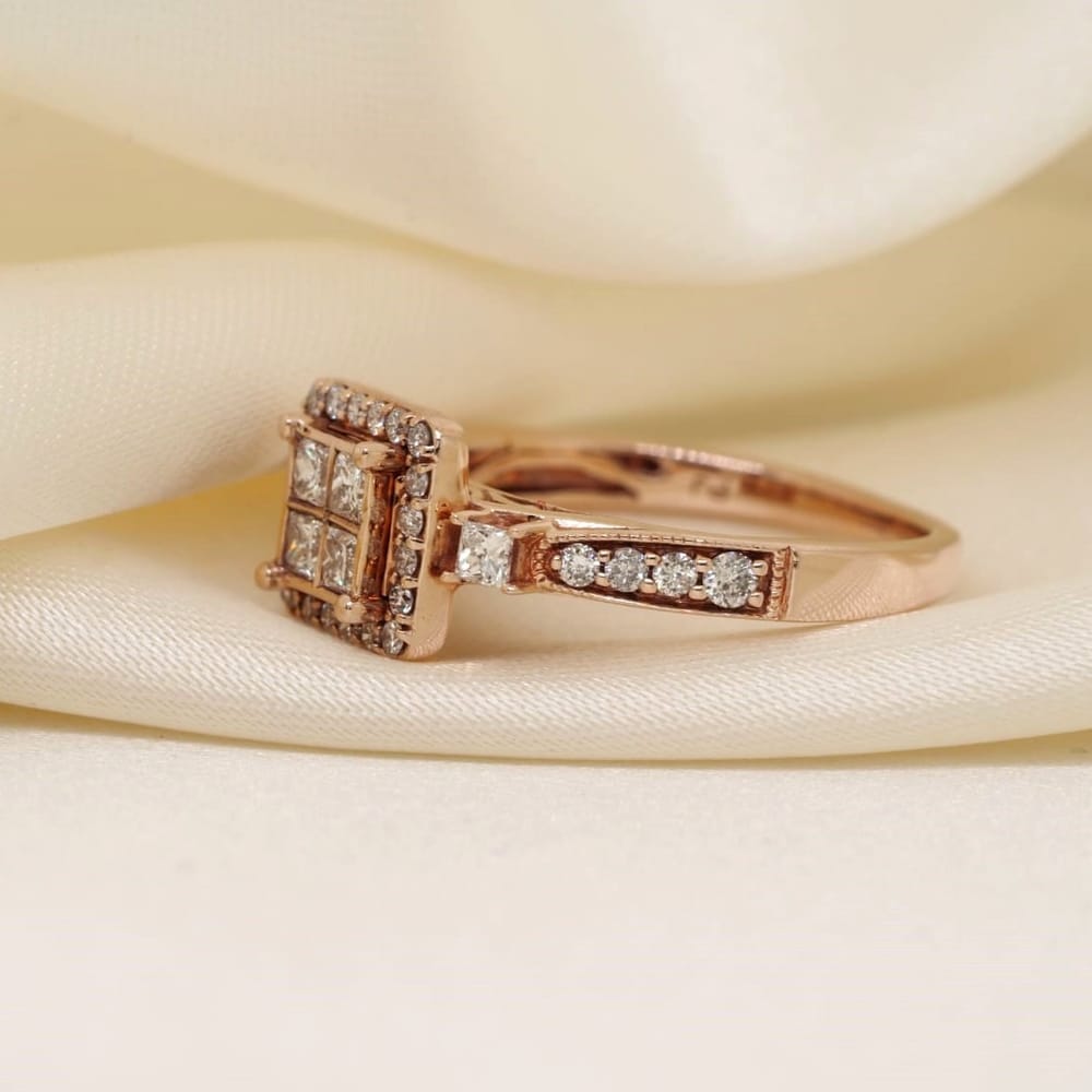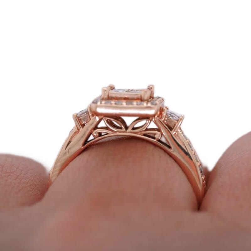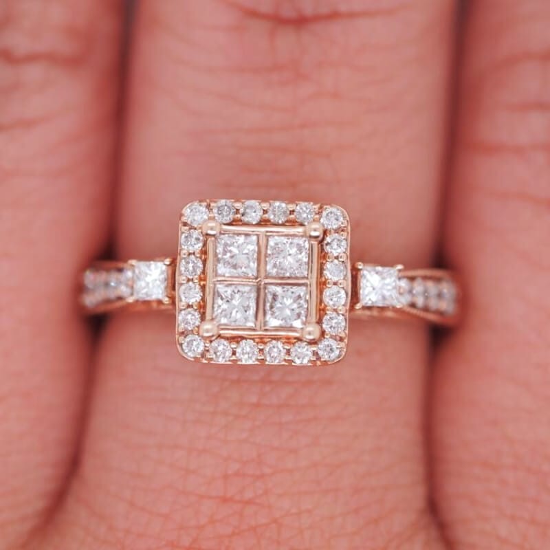This rose gold ring features a quad princess cut center glamorized with a round brilliant cut halo. On each shoulder of this engagement ring sits a single princess cut diamond to introduce a beautiful row of diamonds down the sides.