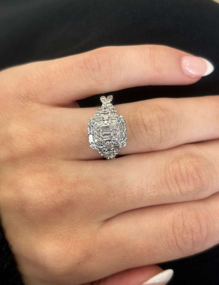 This exquisite engagement ring features a brilliant cluster of natural diamonds, elegantly set in polished 14K white gold.