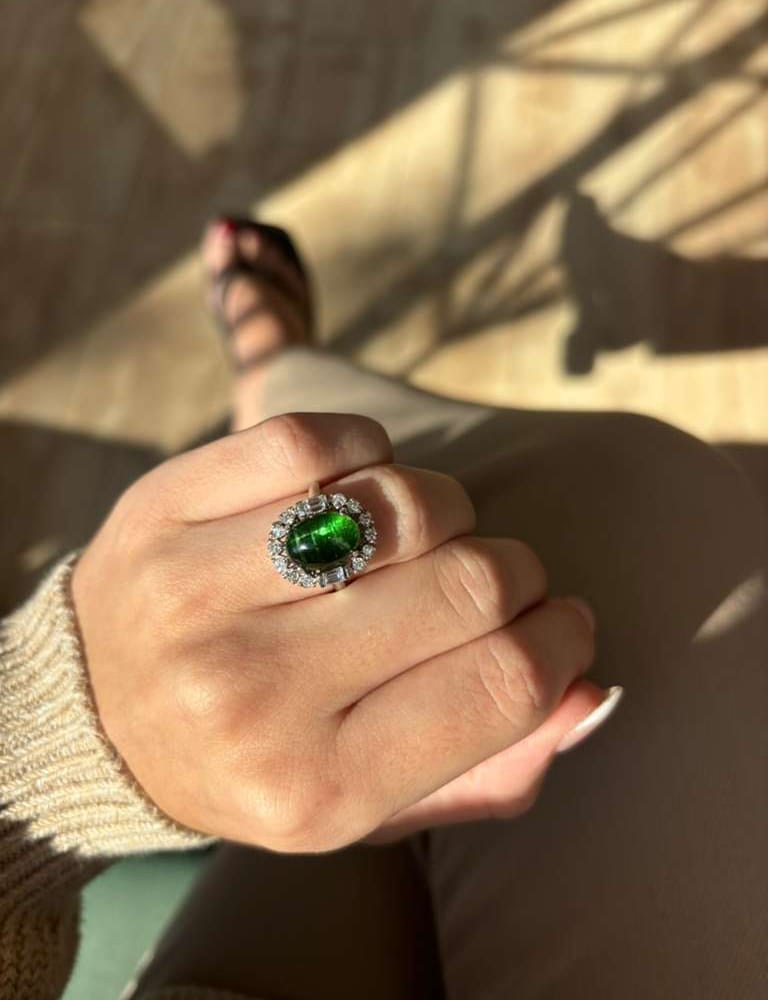 This exquisite ring features a captivating blend of tigers eye and tourmaline, enhanced by shimmering diamonds totaling 0.60 carats, set in luxurious 21kwg.