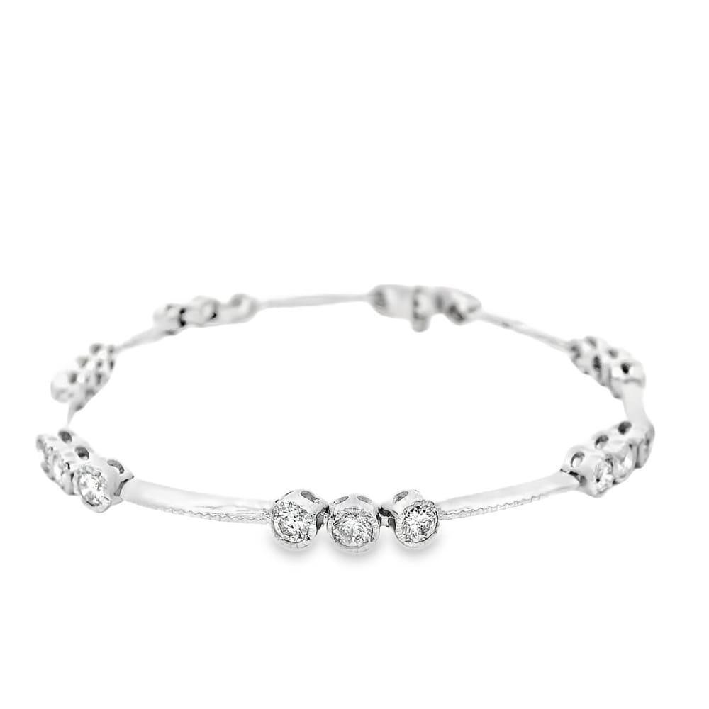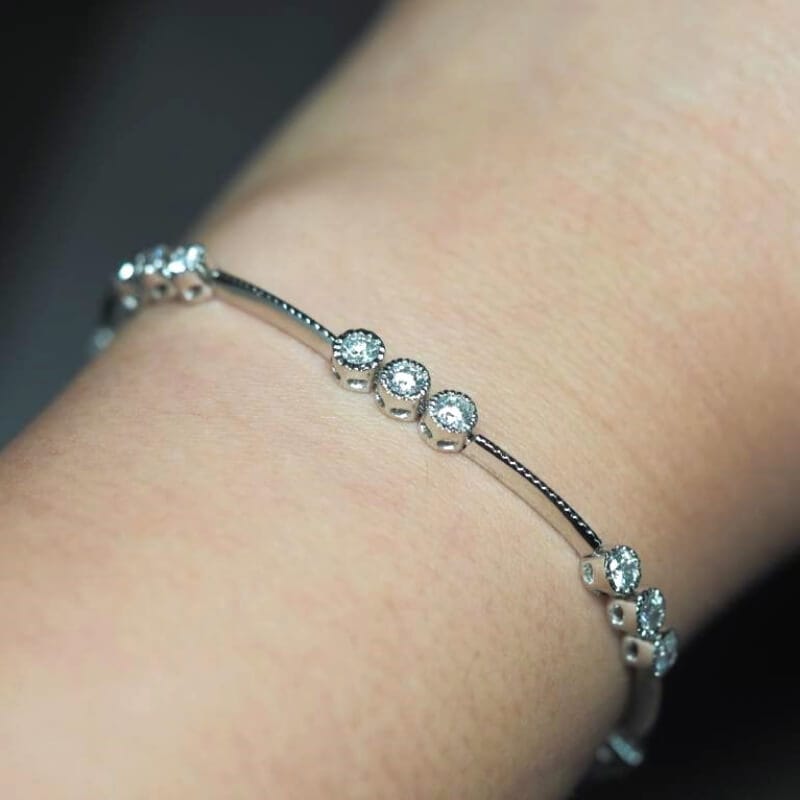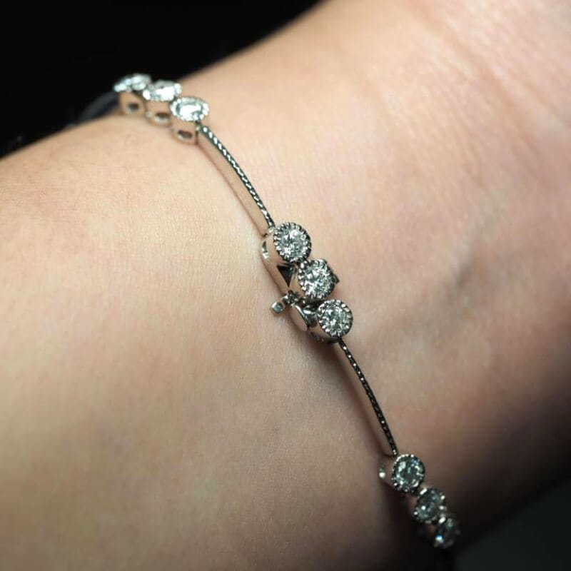 This bracelet features an art deco milgrain decor with a diamond station array holding bezel set diamonds in groups of three.