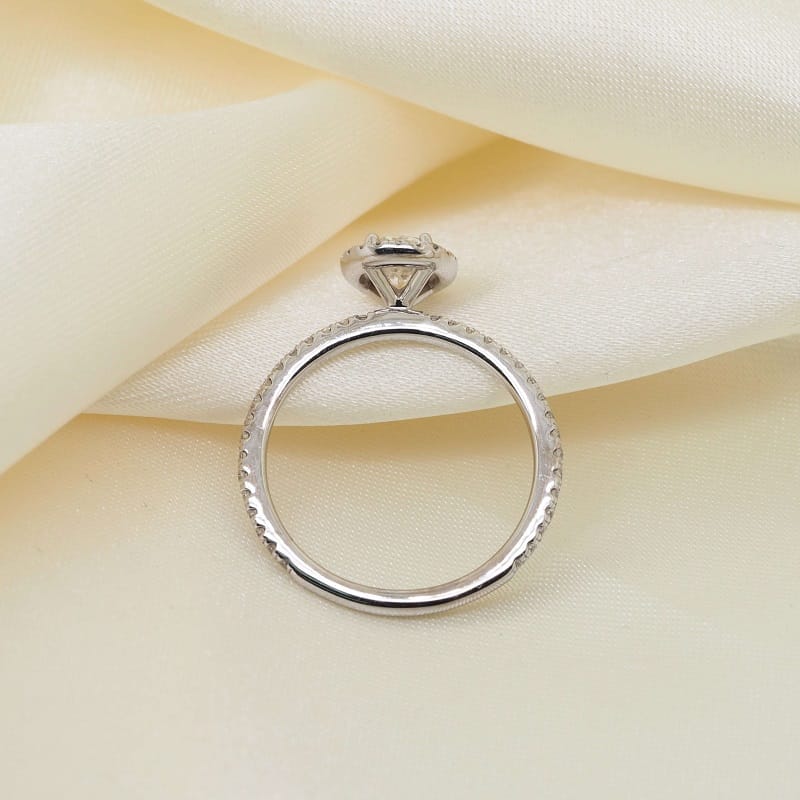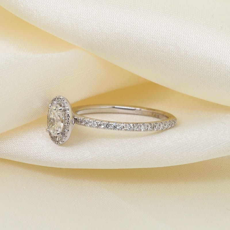 This engagement ring features a GIA certified 0.58 oval diamond center that is accented with a delicate halo on a dainty pavé diamond band.