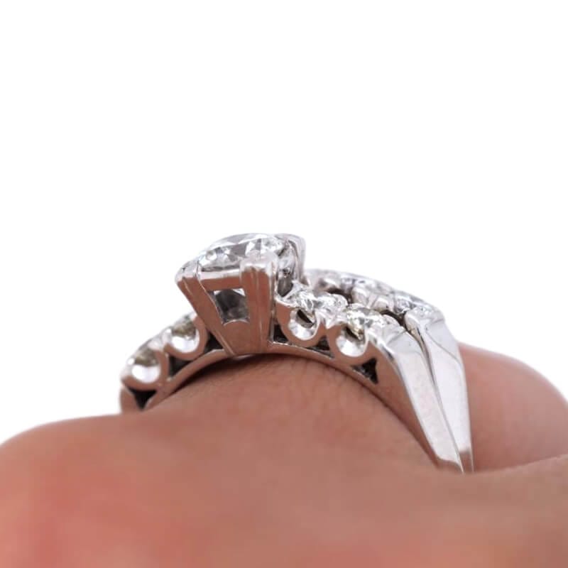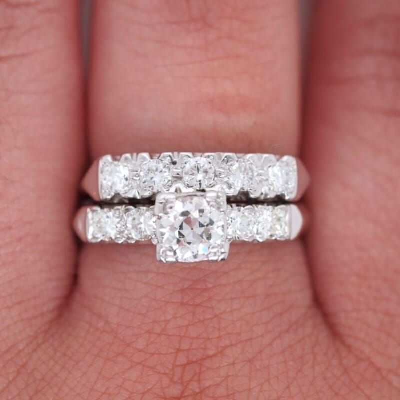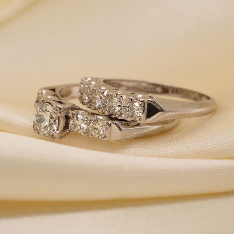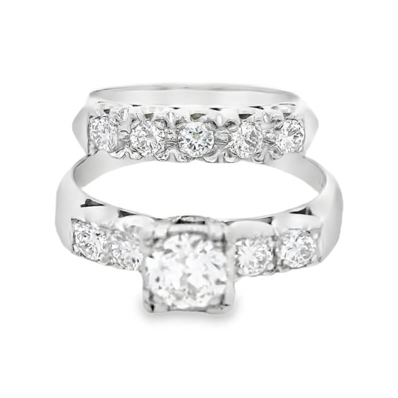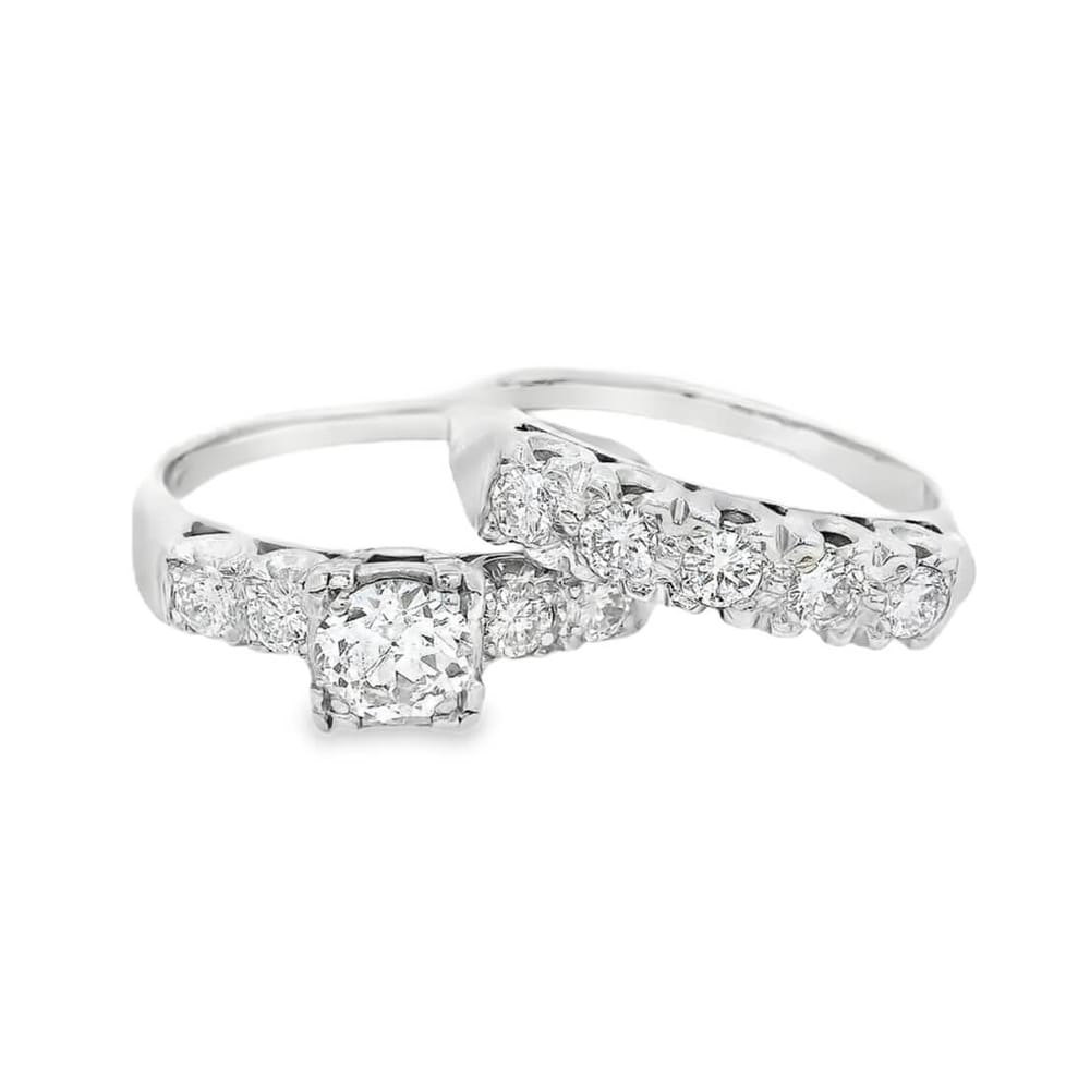 This vintage engagement set features 4 round brilliant cut diamonds with a .50 carat european cut diamond at the center completed with a second 14-karat white gold band.