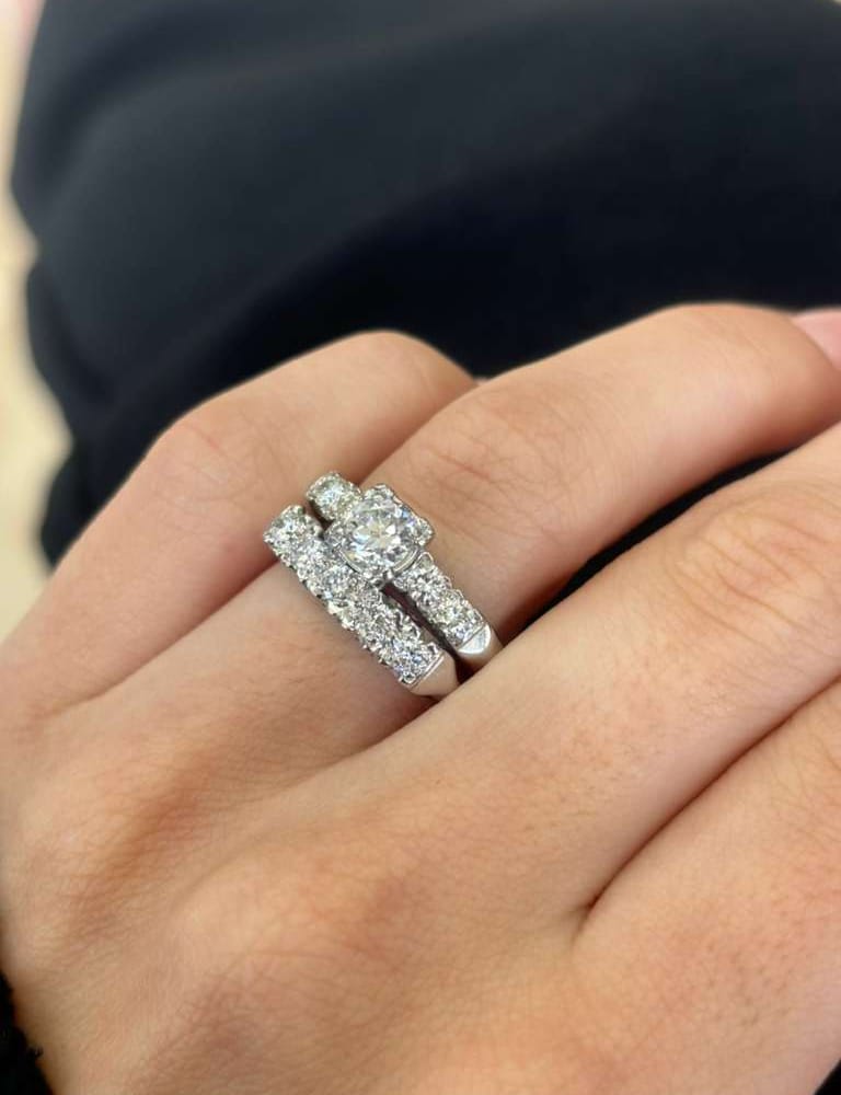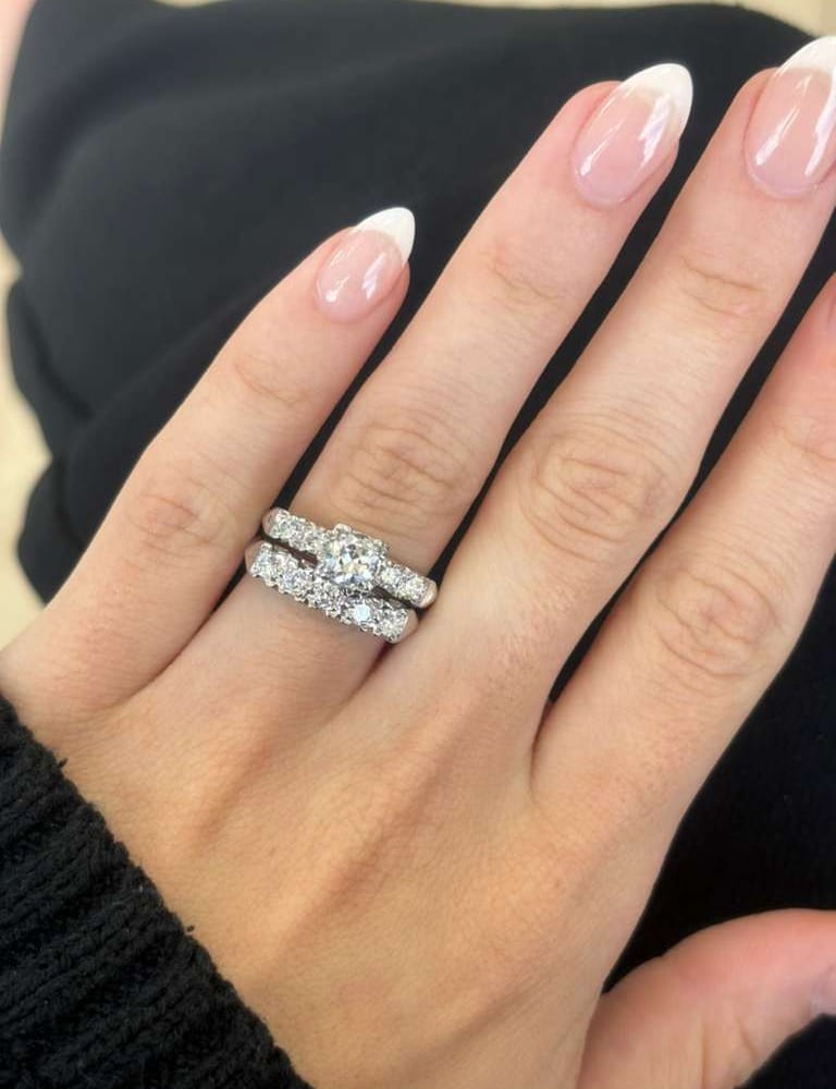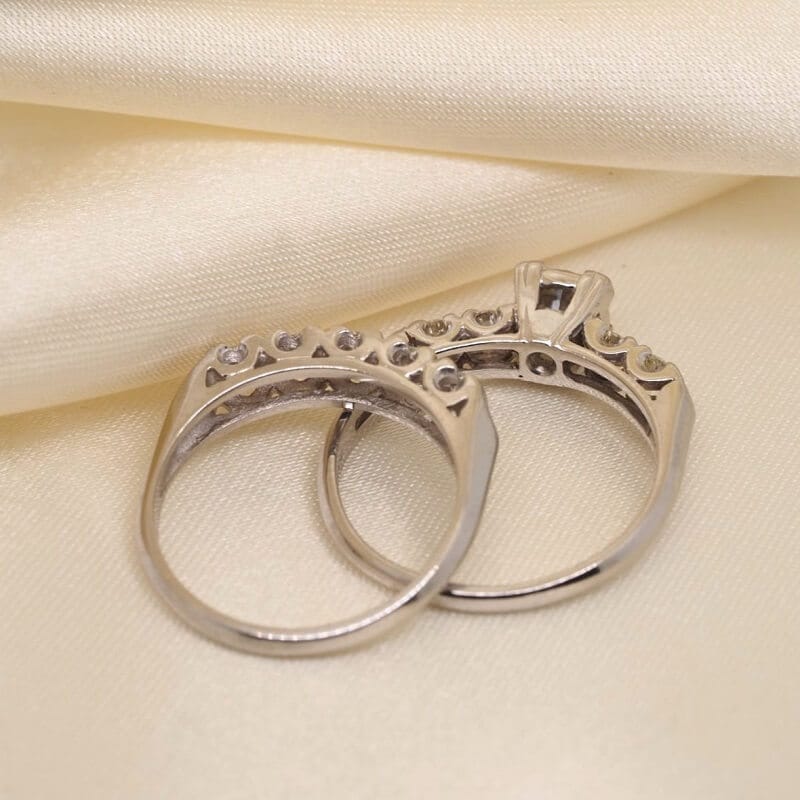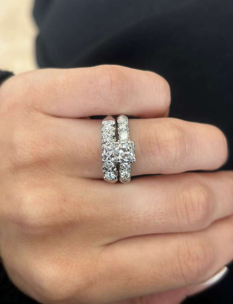 This vintage engagement set features 4 round brilliant cut diamonds with a .50 carat european cut diamond at the center completed with a second 14-karat white gold band.