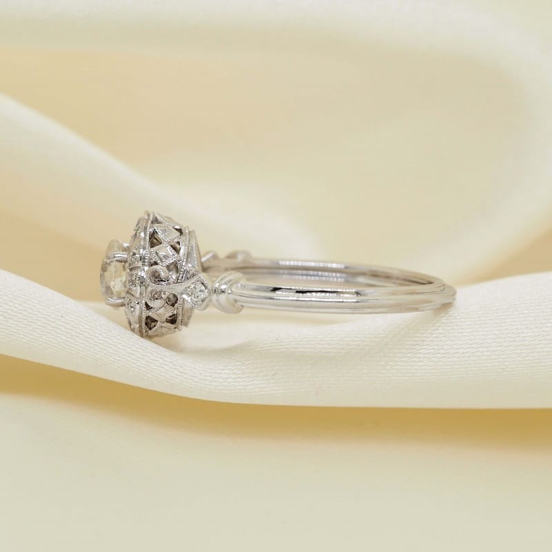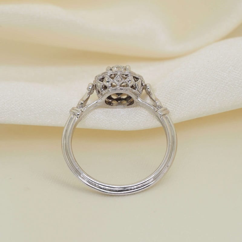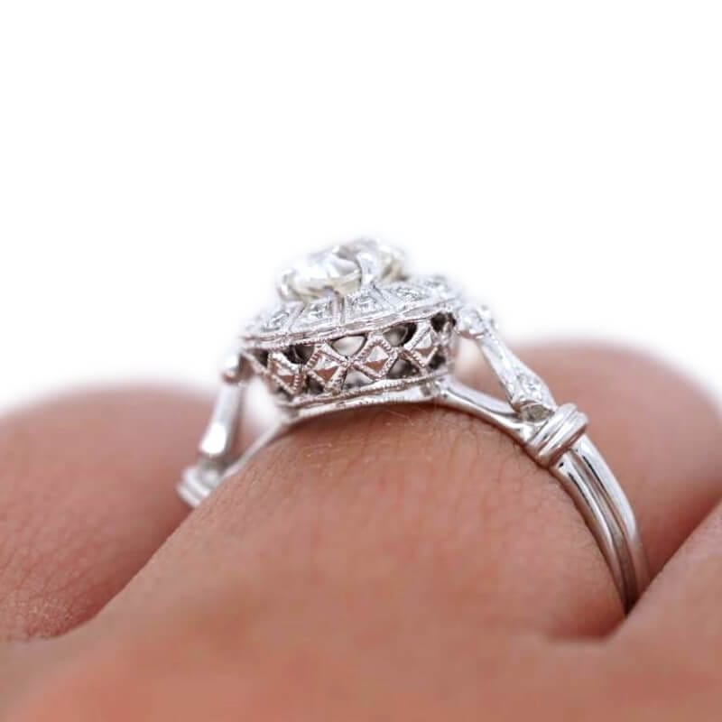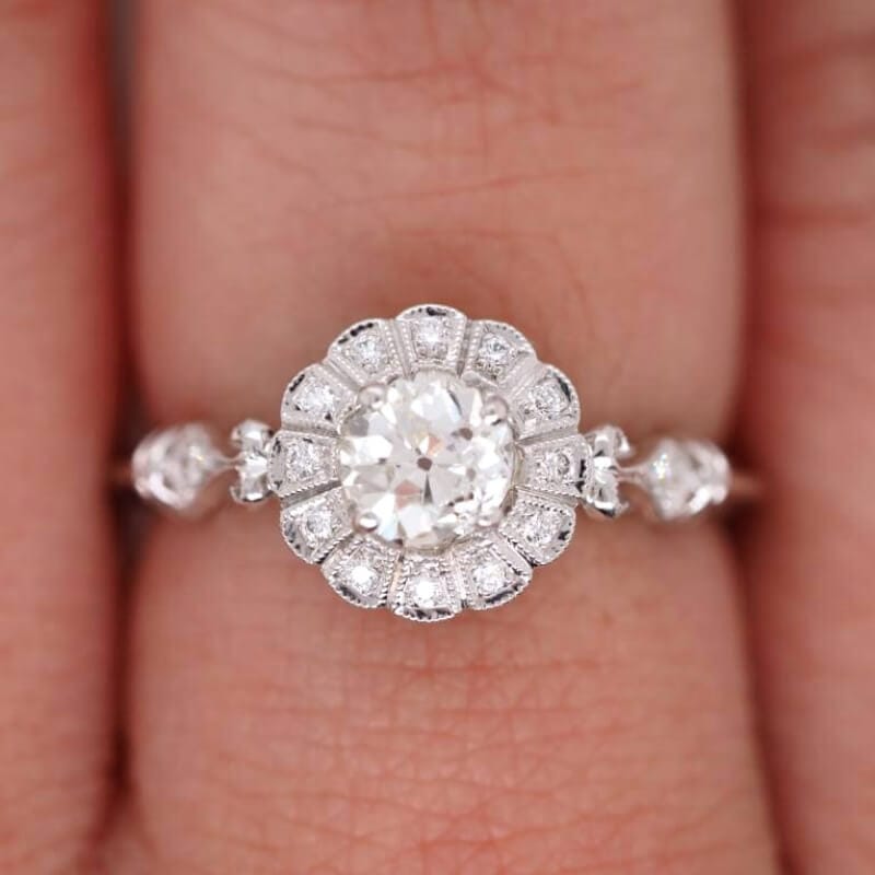 This ring features a .58 carat old european cut center set in a flower halo design that consists of 12 individual bezel set diamonds decorated with a milgrain touch.